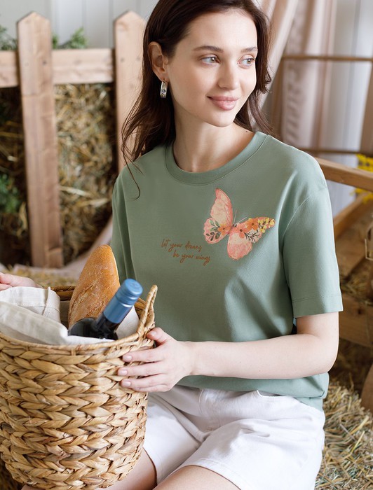 Особое внимание привлекает стильный принт в виде бабочки с минималистичной надписью. Перевод надписи: Let your dreams be your wings - Пусть твои мечты станут твоими крыльями. Принт выполнен красками с устойчивым покрытием, который добавляет изделию оригинальности и позволяет выразить индивидуальность.