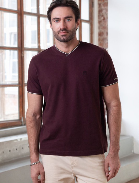 Состав: 95%Хлопок 5%ПУ Плотность: 170 Г/м2Футболка цвета бургунди с аккуратным V-образным вырезом выполнена из премиального хлопка с эластаном плотностью 200 Г/м2. Высококачественный эластичный хлопок обеспечивает мягкость, воздухопроницаемость и идеальную посадку на любую фигуру и размеры, включая 58 размер. Классический прямой крой футболки подчеркивает фигуру, но не сковывает движений. Элегантный небольшой V-образный вырез с контрастной полосой визуально удлиняет шею, а минималистичная вышивка на груди в виде логотипа бренда добавляет изысканности и индивидуальности, не перегружая образ. Эта базовая футболка - идеальный баланс комфорта и стиля для современного мужчины, легко сочетается с разными низами, создавая образ от кэжуал до более элегантного. Стильная футболка подходит как для повседневной носки, так и для создания более нарядных образов.