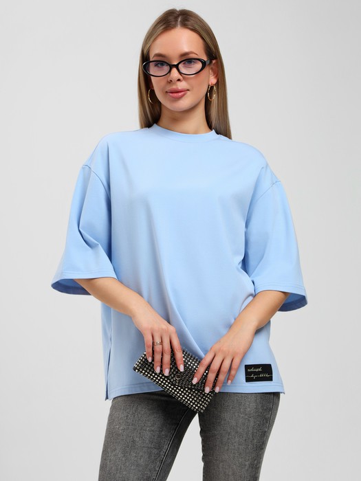 Футболка молодежная из гладкокрашенного полотна «кулирка с лайкрой», свободного покроя, со спущенной линией плеча, втачными рукавами длиной до локтя, горловиной овальной формы, обработанной втачной планкой. Изделие дополнено декоративной нашивкой, в боковых швах выполнены разрезы.