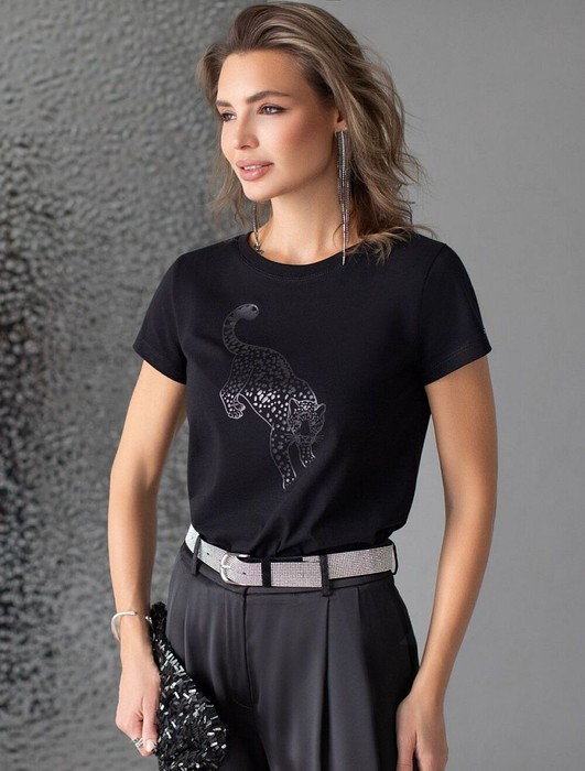 Стильная базовая футболка черного цвета с серебристым принтом фольгой выполнена из плотного хлопка с эластаном для комфортной посадки на любую фигуру. Прямая футболка классического кроя с круглым вырезом, прекрасно подходит для разных типов фигуры, в том числе и на большие размеры. Мягкость хлопка вместе с небольшой долей эластана гарантирует идеальную посадку и свободу движений. Легкая натуральная дышащая ткань премиального качества делает футболку с коротким рукавом идеальным вариантом для повседневной носки дома, на работу или офис. Однотонная футболка дополнена авторским аккуратным принтом с изображением леопарда, который придает праздничный и элегантный вид без лишней вычурности. Блестящий анималистичный принт аккуратно украшает, добавляя изысканный акцент и создавая легкий мерцающий эффект.