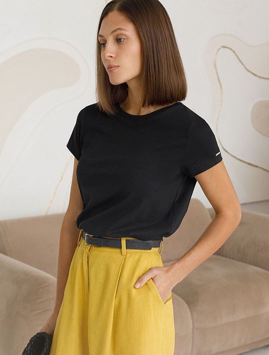 Стильная и модная женская футболка черного цвета станет отличным дополнением к вашему гардеробу. Футболка плотностью 170 Г/м2 изготовлена из премиального хлопка с добавлением эластана. Добавление эластана в состав изделия способствует формоустойчивости. Эта классическая футболка подходит для создания кэжуал образа на каждый день и идеально подойдет для работы. Модель не мнется, что делает ее практичным вариантом для активных женщин, которые ценят стиль и удобство. Благодаря однотонной расцветке эта футболка легко комбинируется с различными элементами гардероба. Она станет универсальным решением для тех, кто предпочитает комфортный стиль casual. Повседневная футболка подчеркнет вашу индивидуальность и позволит вам выглядеть привлекательно в любой ситуации. Легкость в уходе и высокая износостойкость делают ее незаменимой вещью в вашем гардеробе. Одевайте эту модель как на работу, так и на встречу с друзьями — она всегда будет уместна! Стильная и практичная модель с простым кроем и лаконичным дизайном - идеаль