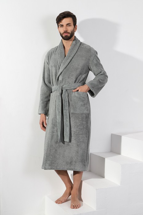 Мужской халат из двустороннего махрового хлопкового полотна. Модель на запах, с поясом в шлёвках, с боковыми карманами, с воротником "шаль", с петлей-вешалкой по горловине спинки.