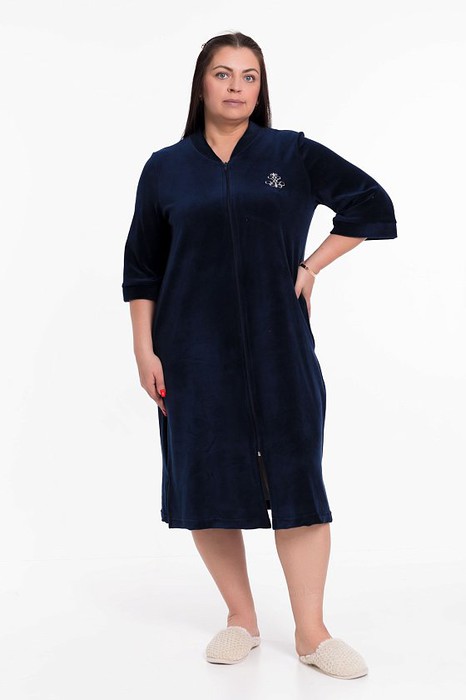 Женский халат — отличный выбор для домашнего отдыха. Он выполнен из мягкого и приятного на ощупь однотонного велюра благородного синего цвета, который обеспечивает комфорт и тепло.