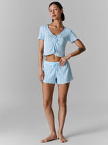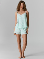 Халат молодежный из гладкокрашенного трикотажного полотна «кашкорсе», на запахе, с длинными втачными рукавами, притачной планкой по бортам и съемным поясом, продетым в две шлевки, вставленные в боковые швы на уровне талии. Нижние срезы рукавов отделаны кружевными вставками фигурной формы, бортовая планка выполнена из трех частей, одна из которых кружевная.