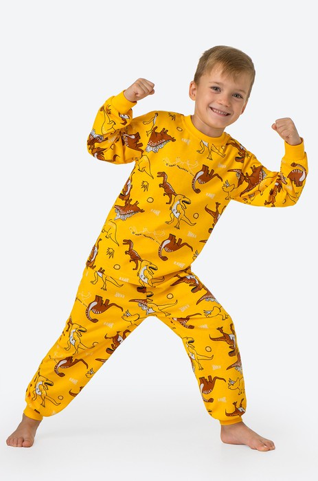 Очаровательная пижама для мальчика в ярком желтом цвете с принтом Динозавры сделает домашние вечера ещё уютнее. Хлопковая трикотажная ткань мягкая и приятная, а забавный рисунок добавляет настроения на каждый день.