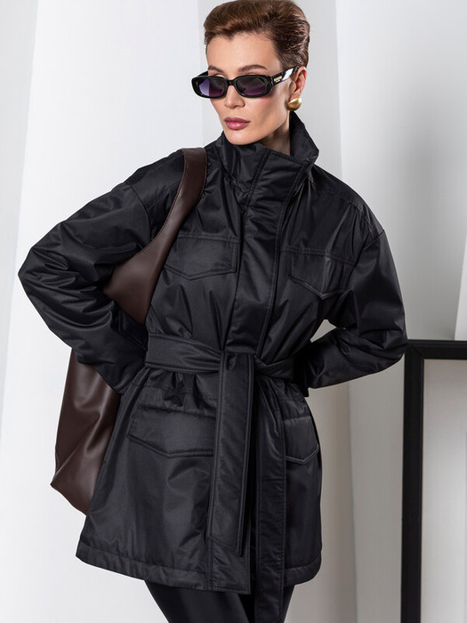 Детали: застежкака на молнию и потайные кнопки, декоративные паты, в комплекте пояс из основной ткани
