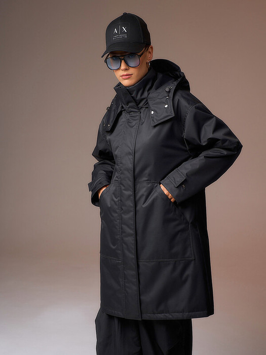 Утепленный плащ на молнии с планкой на кнопках. Капюшон отстежной с утяжкой. В изделии два функциональных кармана.