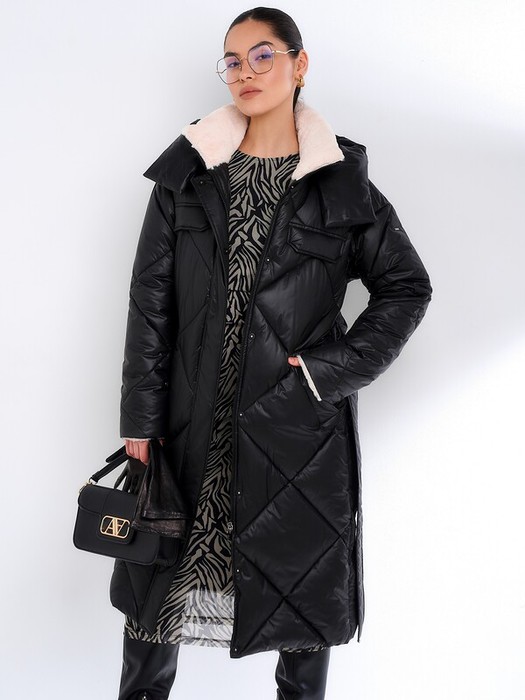 Детали: отстежной капюшон, воротник-стойка и обтачка рукава обработаны мехом,