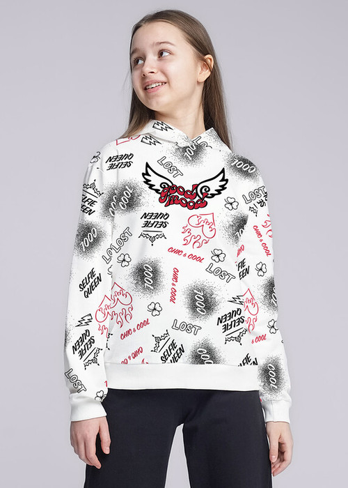 Худи из теплого футера с объёмными рукавами. Эластичный пояс и манжеты из кашкорсе. Украшено сплошным принтом. Слегка расслабленный силуэт и удобная посадка.