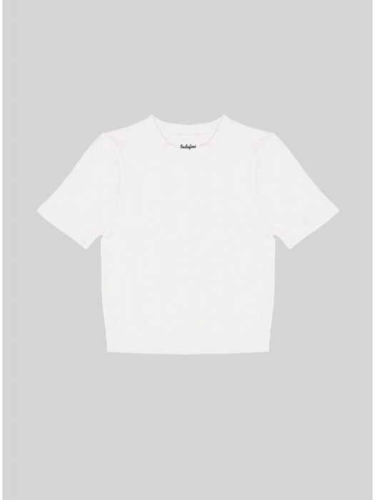 Футболка из полиамида, белого цвета, с короткими рукавами, с небольшим горлом, в рубчик, облегающая, укороченная.