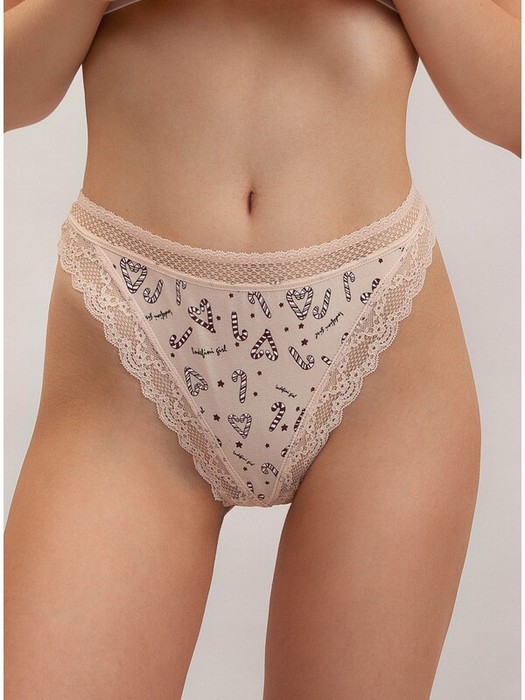 Женские трусы от торговой марки Индефини. Трусы-стринги из хлопка, бежевого цвета, с принтом, с кружевным обрамлением, на мягкой резинке, средней посадки.