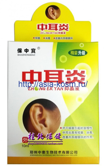10 мл.Состав: берберин, борнеол, шичанпу, гирчевник, глицерин.Капли сделанные на основе китайской народной медицины, обладают антибактериальным и противовоспалительным эффектами. Эффективны при лечении и профилактики ушных заболеваний. Снимают ушные боли, устраняют заложенность, очищают слизистую оболочку.Механизм действия: стерилизация, дезинфекция, улучшения микроциркуляции внутреннего уха.Способ применения: при снижении слуха: применять по 1-2 капли в каждое ухо 3 раза в день.Курс: 7 дней. Рекомендуется применять 4 курса подряд в течение 2 месяцев с перерывами между курсами 3 дня.Способ применения: при воспалительных процессах, отите: рекомендуется применять по 2 капли в каждое ухо 3 раза в день в течение 7 дней.