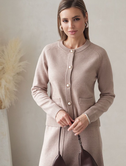 Состав: 52%ПАН (акрил) 33%ПЭ 8%ПУ 7%Кашемир Размер товара на первом фото: 42Кардиган выполнен из мягкой меланжевой пряжи с добавлением кашемира. Модель прямого силуэта гармонично впишется в любой образ с брюками, юбками и джинсами. Застежка на пуговицы в жемчужно-золотистом оттенке. Изделие очень приятное к телу, совершенно не колется и отлично сохраняет тепло. Сочетается в костюме с брюками D38.013, D38.012 и юбкой D36.016