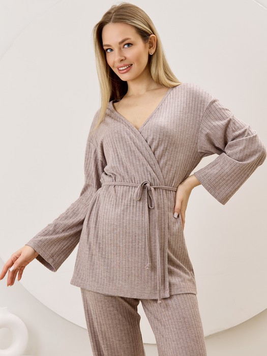Кардиган-кимоно женский из гладкокрашенного трикотажного фактурного полотна в «рубчик» с добавлением ангоры, на запахе, прямого силуэта, с длинными втачными рукавами. Нижние срезы рукавов, так же низ изделия-обработаны подгибкой, борта полочки и горловина окантованы основным материалом. Изделие укомплектовано съемным поясом, вытачанным из окантовки.