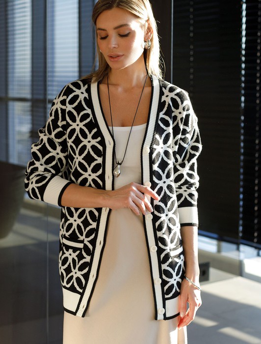 Состав: 50%Вис 20%ПА 20%ПЭ 10%Кашемир Параметры модели на первом фото: Рост 170, бюст 89, талия 63, бедра 92Кардиган жаккардовой вязки выполнен из нежной пряжи на основе вискозы с добавлением кашемира. Мягкая модель не раздражает кожу, приятно ощущается на теле и поддерживает комфортный микроклимат. Совет стилиста: модель гармонично впишется в любой гардероб, добавив образу выразительности. Сочетайте с однотонными брюками, юбкой, платьем или джинсами