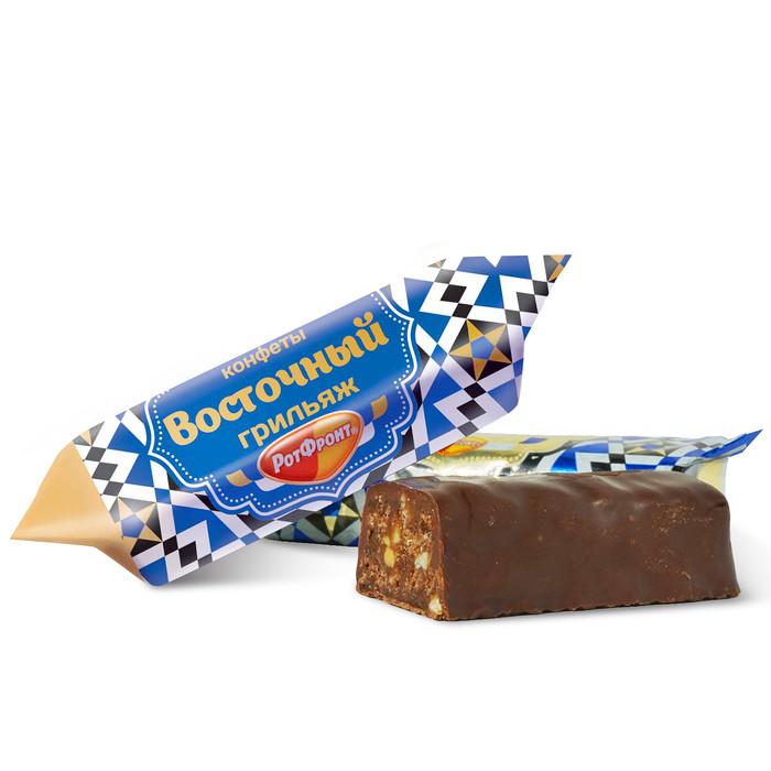 Конфеты «Восточный грильяж» от фабрики «Красный Октябрь». Ароматный тягучий грильяж, покрытый шоколадной глазурью. Оригинальное сочетание вкуса орехов и семян, окутанных вязкой, тянучей карамельной сладостью, с темной пряной шоколадной глазурью. Нежное восточное удовольствие для любителей ореховых козинаков.