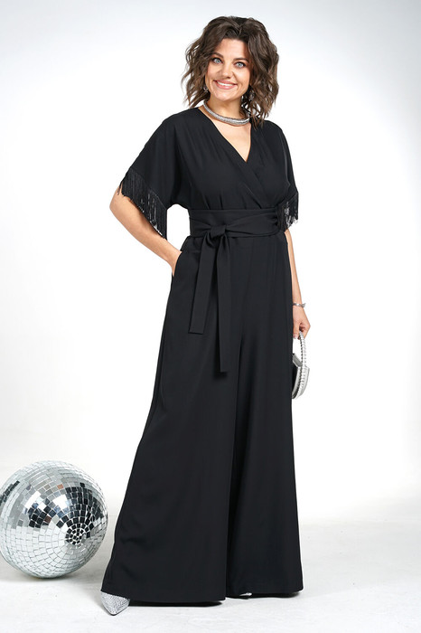 Комбинезон женский отрезной по линии талии, со спущенной линией плеча понизу с отделочной тесьмой «бахрама», с притачным поясом и съёмным завязывающимся поясом по линии талии. С застёжкой по среднему шву спинки на потайную молнию. Лиф переда на запах. Лиф спинки с талевыми выточками. Брюки расширенного силуэта, передние части с косыми боковыми карманами, задние с талевыми выточками.