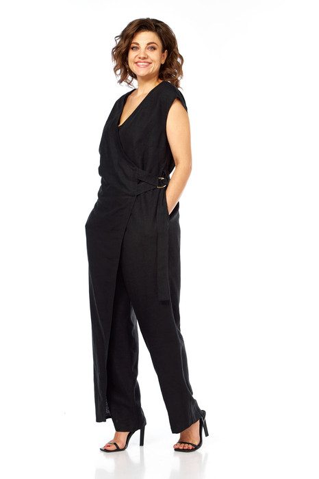 Комбинезон женский с центральной застежкой на потайную молнию и отлетной частью на запах с хлястиком и полукольцами. Задние половинки собраны на резинку в области талии. Передние воловинки с нагрудными вытачками и резинкой в области талии + шлевки. В боковых швах обработаны карманы. Ширина по талии регулирется поясом, который вставлен в правый боковой шов. В области правого кармана отделка в виде металлической подвески. По краю борта отлетной чатси отделочная строчка на 3 см.
