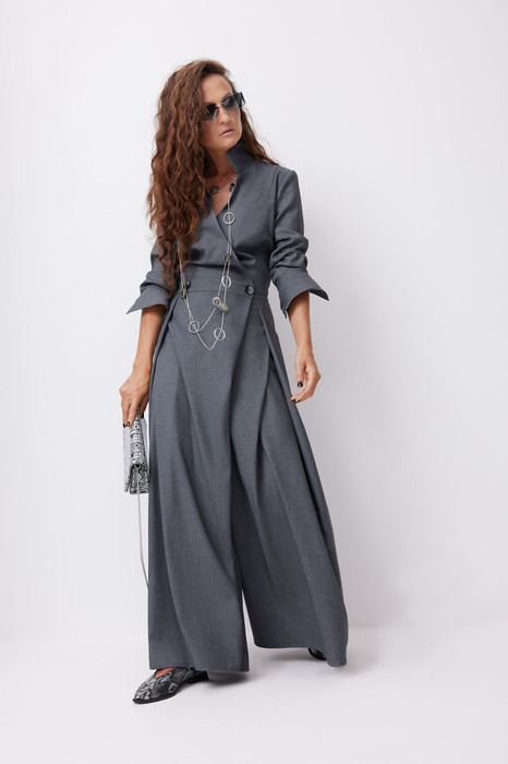 Комбинезон женский, отрезной по линии талии. Верхняя часть с рельефами по переду и вытачками по спинке. Воротник стояче-отложной. Застёжка на запах, на петли, пуговицы и потайную магнитную кнопку. Рукав втачной длинный, заканчивается манжетой с застежкой на петли-пуговицы. Нижняя часть комбинезона со складками и имитацией запаха. В боковых швах карманы. По спинке резинка на уровне талии.