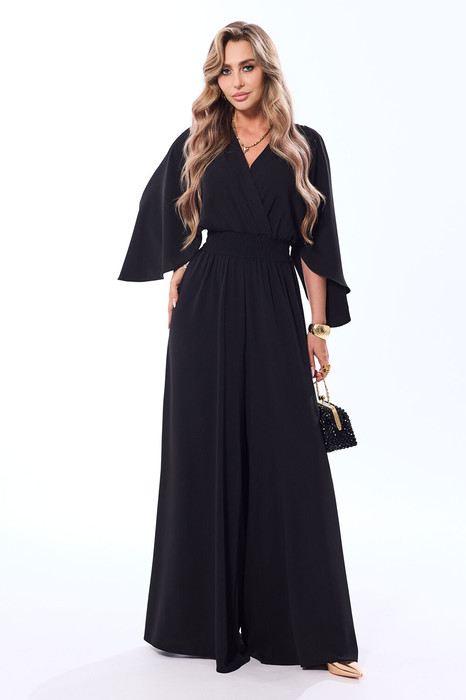 Комбинезон с застежкой на навесную петлю и пуговицу по горловине спинки, с цельнокроенным рукавом- крылышко. Лиф переда с V-образным вырезом горловины, полочки расположены на запах. Лиф спинки со средним швом. Комбинезон с втачным поясом. Пояс присборен эластичной нитью- венгеркой.