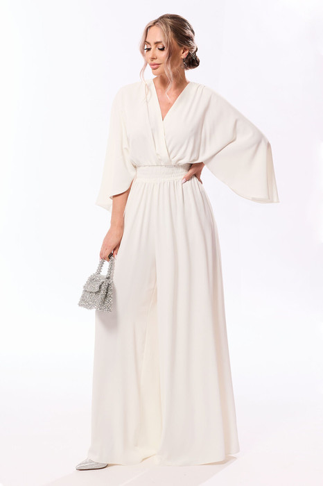 Комбинезон с застежкой на навесную петлю и пуговицу по горловине спинки, с цельнокроенным рукавом- крылышко. Лиф переда с V-образным вырезом горловины, полочки расположены на запах. Лиф спинки со средним швом. Комбинезон с втачным поясом. Пояс присборен эластичной нитью- венгеркой.