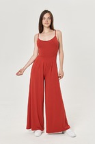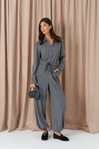 Стильный легкий комбинезон прямого силуэта длиной 7/8, без рукавов, с V-образным вырезом горловины. Дополнен удобными боковыми карманами. Притален съемным поясом, выполненным из основной ткани. Застежка комбинезона на молнию в среднем шве спинки. Длина комбинезона от плечевого шва 132см.