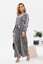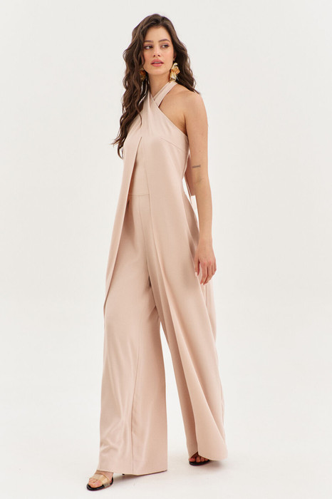 Комбинезон полуприлегающего силуэта. Комбинезон отрезной по линии талии. Лиф переда и спинки с рельефами. В среднем шве спинки вставлена потайная тесьма-«молния». Брюки длинные, широкие. По задним половинам брюк талиевые вытачки. По передним половинам односторонние складки. В боковые швы вставлены отлетные детали, которые переходят в завязки вокруг шей.