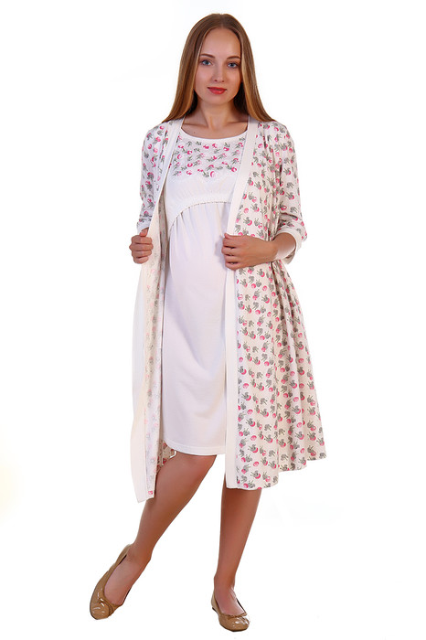 Описание: Силуэт полуприлегающий, халат по спинке 94 см, горловина круглая, рукав 3/4, с припуском на живот, застежка на бант из полупоясов, карманы овальные в боковых швах. Сорочка длина по спинке 88 см, с секретом для кормления, печать «шелкография» по горловине изделия.