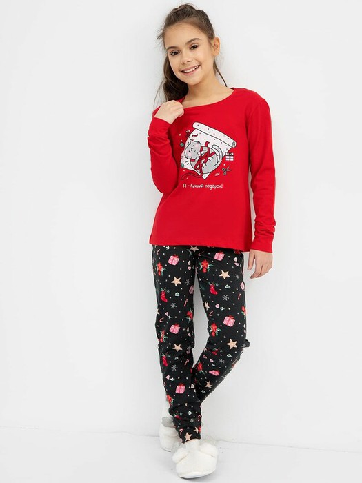 Уютная хлопковая пижама для девочки. Широкие эластичные манжеты на рукавах лонгслива и штанинах брюк. Интересный симпатичный дизайн. Продуманная конструкция. Идеальный вариант для приятного сна и расслабленного отдыха