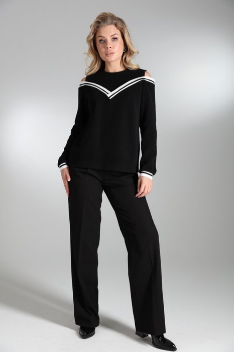 Джемпер свободного объёма, оригинального кроя, с имитацией топа и открытыми плечами. Горловина круглая, по спинке застежка на петлю и пуговицу  Отделка горловины джемпера  и манжеты  выполнены из довязов в контрастном цвете.
