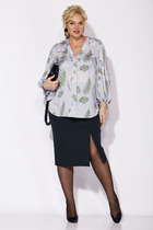 Блузка свободного объёма с короткими цельнокроеными рукавами с подворотами. Вырез горловины круглый. По переду подрез ниже линии груди.