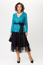 Жакет женский прямого кроя с втачным рукавом. Застежка центральная на молнию. По горловине отложной воротник. По переду декоративные клапаны и планка. По линии груди вытачки. В боковых швах обработаны разрезы. Рукав 7/8 с манжетой. Клапаны, планка по переду и манжеты выполнены из ткани с пайеткой.