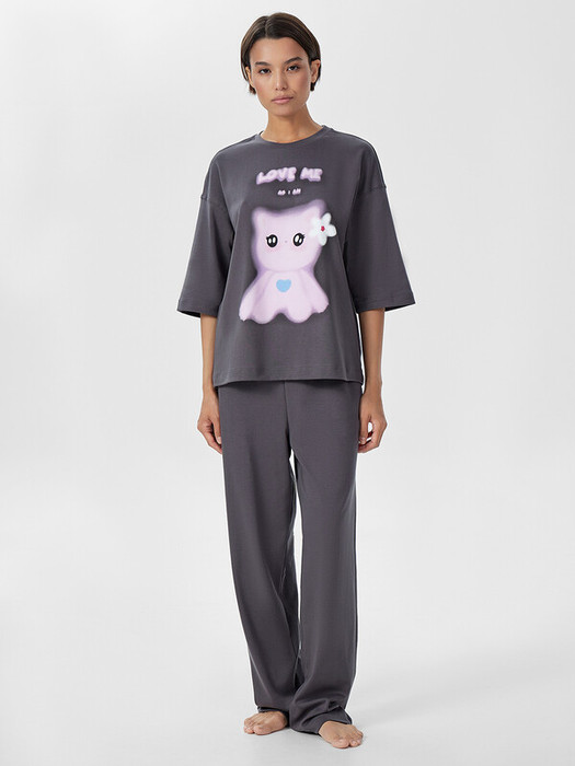 Футболка свободного силуэта. Горловина круглой формы с обтачкой из основного полотна. Рукава втачные свободные, линия плеча спущена. Низ рукавов футболки обработаны швом в подгибку. Брюки прямые свободные. Пояс отрезной с эластичной тесьмой внутри, отстрочен. На передних деталях шорт карманы «хулиганы».Низ брюк в подгибку.