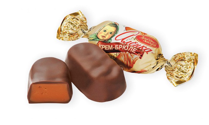 Конфеты «Алёнка» крем-брюле – маленькие конфеты в форме традиционных «кирпичиков» с закругленными краями. Нарядные блестящие фантики делают их прекрасным праздничным угощением. Изысканный вкус темной молочно-шоколадной помадки, сливочно-карамельный вкус крем-брюле, тонкая нежная шоколадная глазурь – любимая «Алёнка» в новом, более утонченном формате.