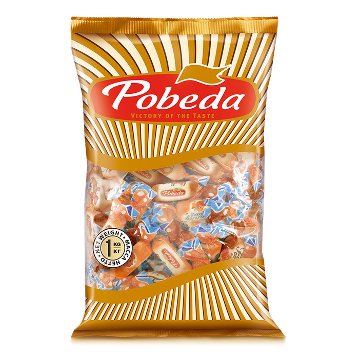 Всеми любимая «Коровка» от фабрики «Победа» – это натуральные сливочное масло и сгущенное молоко. Мягкий сливочно-карамельный вкус с легким оттенком топленого молока и начинка со сгущенкой. В этом ассорти два вкуса: со сгущенным и вареным сгущенным молоком. Хочется раскусить и, как в детстве, на миг забыть обо всем.
