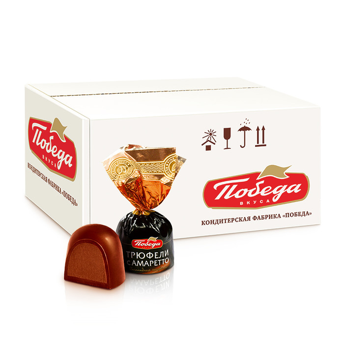 Трюфели от «Победы» – это трюфельное «сердце» из сливок и шоколада в окружении нежной шоколадной оболочки. В этот рецепт добавлен ликер амаретто, его сладкий вкус с благородной горчинкой и миндальным ароматом идеально дополняет шоколад.