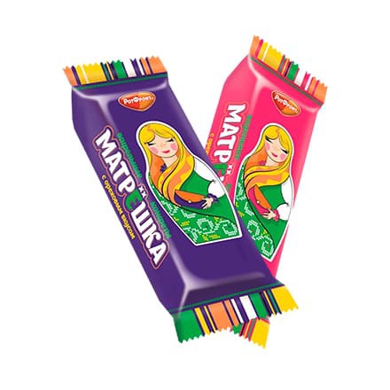 Конфеты «Матрёшка» – пластины тонких вафель, прослоенные сливочно-ореховым кремом и покрытые гладкой глазурью. Крупные, хрустящие конфеты с насыщенным ореховым вкусом. Внушительный размер и красивая обертка делают конфеты «Матрёшка» отличным сувениром.