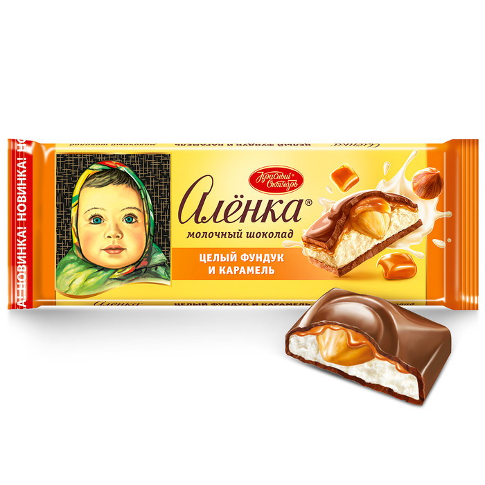 Новый молочный шоколад «Алёнка» с целым фундуком и карамелью - большая плитка с оригинальным вкусом для любителей питательных целых орехов. Внутри - двухслойная начинка с мягкой карамелью и фундуком.