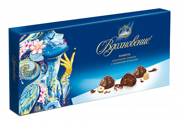 Конфеты в коробке «Вдохновение» – коренастые полукруглые конфеты из шоколадно-орехового пралине, в котором рассыпались осколки дробленого фундука. Плотная, чуть рассыпчатая текстура, узорная темная глазурь. Насыщенный аромат шоколада и богатый вкус какао и орехов – замечательный подарок для настоящих ценителей шоколадных конфет.