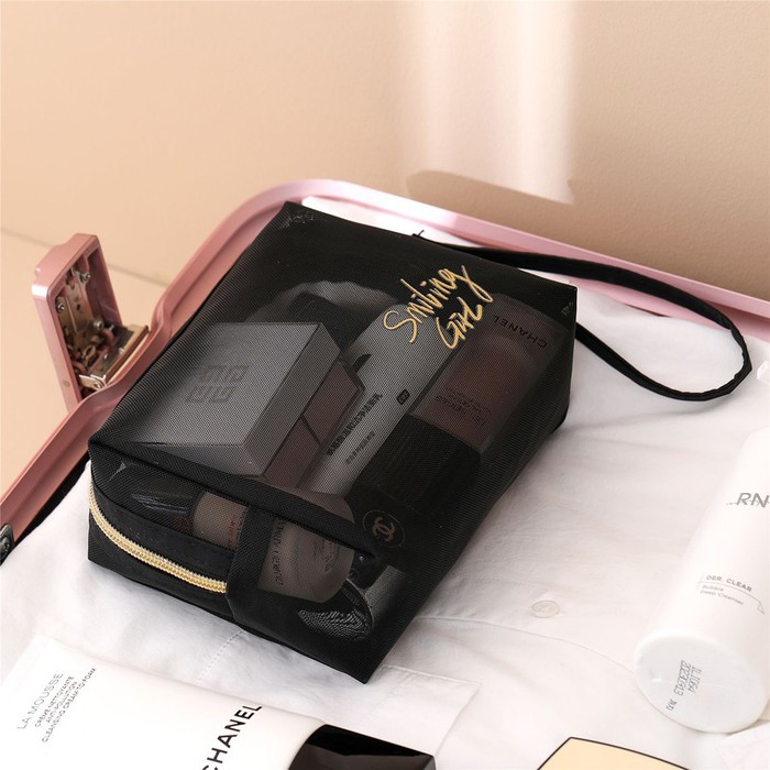 Прозрачный органайзер изготовлен из мягкой нейлоновой сетки в стильном черном цвете. Бегунок на молнии декорирован золотой звездочкой.Дышащая ткань не допустит оседания посторонних запахов. Косметичка легко стирается и быстро сушится. Удобный аксессуар для хранения средств по уходу и предметов личной гигиены. Идеальна для любых путешествий, командировок и поездок на море, а также для хранения косметики и различных аксессуаров дома.