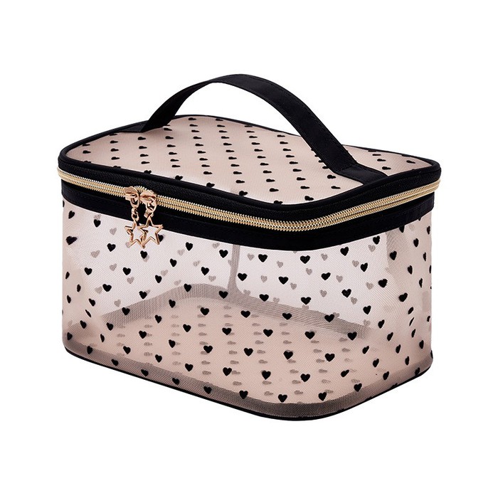 Прозрачный органайзер изготовлен из мягкой нейлоновой сетки в стильном бежевом цвете с черными сердечками. Бегунок на молнии декорирован золотой звездочкой.Дышащая ткань не допустит оседания посторонних запахов. Косметичка легко стирается и быстро сушится. Удобный аксессуар для хранения средств по уходу и предметов личной гигиены. Идеальна для любых путешествий, командировок и поездок на море, а также для хранения косметики и различных аксессуаров дома.