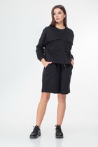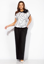 Костюм женский из кулирного полотна состоит из туники и брюк. Туника приталенного силуэта, спущенный рукав, в плечевых швах - вставки из основного полотна. Горловина круглая, на полочке принт. Низ изделия обработан на плоскошовной машине. Брюки прямые, верх на поясе с резинкой, в боковых швах карманы. Низ изделия обработан на плоскошовной машине.