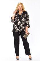 Костюм женский из кулирного полотна состоит из футболки и брюк. Футболка прямой силуэт. Горловина круглая, рукав короткий, втачной, низ изделия обработан на плоскошовной машине. Брюки прямые, верх на поясе с резинкой, в боковых швах внутренние карманы, низ изделия с манжетом. На полочке и передней половине брюк принт.
