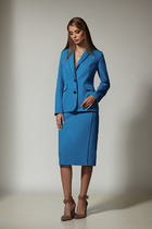 Костюм женский из кулирного полотна состоит из футболки и брюк. Футболка - прямой силуэт, горловина круглая, рукав короткий, втачной, низ изделия обработан на плоскошовной машине, на полочке принт. Брюки прямые, верх на поясе с резинкой, в боковых швах внутренние карманы, низ изделия на манжете.