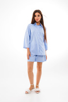 Костюм женский футболка и брюки. Футболка прямого силуэта со спущенной линией плеча. Рукав втачной короткий с притачной манжетой. Горловина футболки округлой формы, обработана воротником стойкой. На полочке принт. Низ изделия подогнут. Брюки прямого силуэта с притачным поясом. Карманы формы "хулиган". Низ брюк подогнут.
