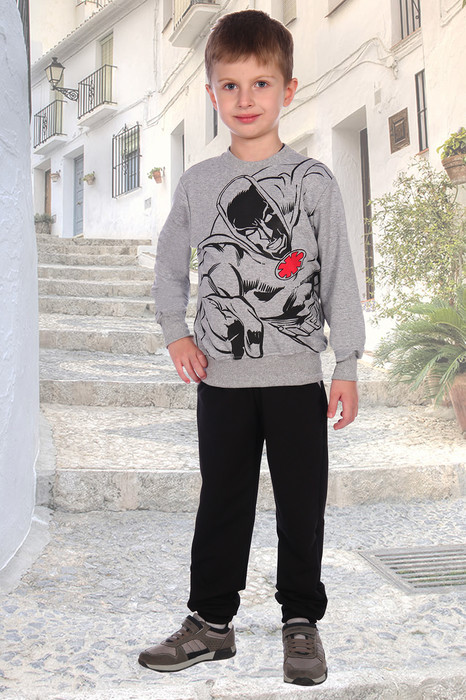 Костюм детский из футера толстовка и брюки. На толстовке современный принт в виде супер-героя. Брюки с манжетами и карманами по бокам. Костюм удерживает тепло и удобен в использовании. Брюки на резинке.