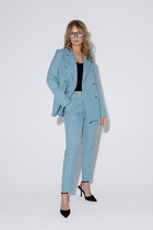 Комплект состоит из футболки и брюк. Брюки на эластичном поясе, с карманами, с лампасами вдоль боковых швов. Спереди по шву притачивания пояса заложены складки. Футболка прямого силуэта, с асимметричным низом и обработанным разрезом в нижней части удниненного бокового шва. На полочке расположены симметричные кокетки. Горловина обработана обтачкой. Рукав цельнокроеный короткий, обработанный бейкой из основного полотна.