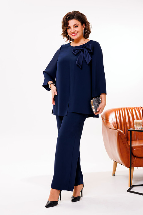Нарядный комплект, состоит из блузы и брюк. Блуза прямого силуэта, выполнена из ткани ЭФА с добавлением вискозы. Перед блузки декорирован дизайнерскими люверсами, украшенные камнями и бантом-завязкой из атласной ткани, что придет модели особый стиль и шарм. Рукав блузки втачной. Брюки прямые, выполнены из ткани ЭФА с добавлением вискозы, на поясе с резинкой, в боковых швах функциональные карманы. Комплект удобный и практичный, прекрасно дополнит ваш нарядный образ.