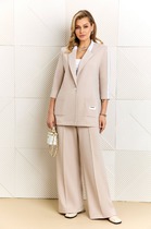 Стильный и мега крутой костюм, выполнен из премиального трикотажа Бифлекс (не скатывается и идеально держит форму). Жакет прямого силуэта, без подкладки. Перед жакета по горловине декорирован трикотажным довязом, что придает модели особую изящность. Жакет с накладными карманами и декорирован пришивным украшением, с застежкой на пуговицу. Рукав длиной 3/4, декорированы пришивным трикотажным лампасом. Брюки прямые, пояс на резинке, в боковых швах с функциональными карманами. Модель костюма стильная и практичная, займет почетное место любимой модели в вашем гардеробе, отлично подойдет для ежедневной носки и работы, удобно носить с кроссовками и любой классической обувью.
