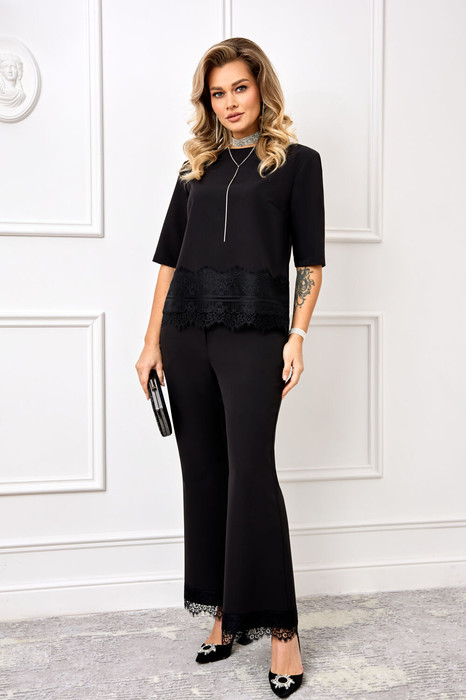 Стильный и невероятно удобный комплект, состоит из блузы и брюк. Блуза прямого силуэта, выполнена из ткани Барби с добавлением вискозы. Низ блузы декорирован французским кружевом, по спинке с застежкой на молнию. Рукав втачной, слегка спущенный. Брюки на поясе, по спинке с резинкой, спереди с застежкой на молнию и пуговицу. Брюки модного в этом сезоне силуэта, слегка заужены в области колена и расклешены к низу. Низ брюк декорирован французским кружевом.